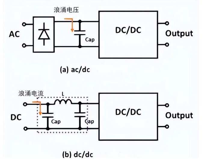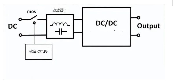 為了降低輸入/輸出的紋波噪聲或EMI噪聲,現在通常是在輸入側并聯電容或者濾波器,如下所示。由于濾波器中有電容,當系統開始上電時,由于輸入電壓的快速上升,會產生很高的浪涌電流。這種情況可能會導致前端電源供電不足,或者觸發過流保護,導致無電壓輸出,因此,浪涌電流的抑制變得越來越重要。