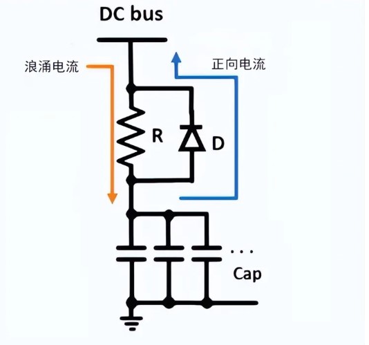 如下所示,主要用于應用電路需要外接大量電容時。如果沒有外部限流電路,直流母線電壓開啟時會產生很大的浪涌電壓,可能導致前端電源壓降進入保護模式。此時,只需在電容輸入串聯電阻和二極管即可,可以減輕浪涌電流。當直流母線通過電阻給電容充電時,可以限制浪涌電流,但是,當直流母線需要供電時,電容可以通過二極管將電能反饋給直流母線。